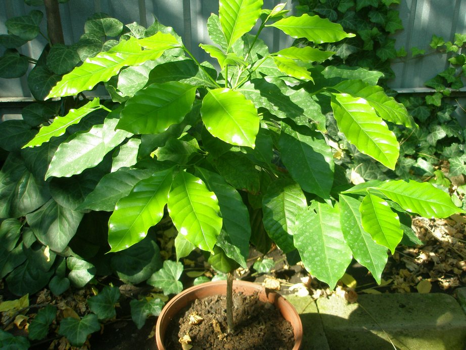 Кофе растёт больше вширь чем вверх. Сам себе режиссёр и прищеплять даже не понадобилось. Условия - солнце, воздух и вода. Только подкислить почву пришлось, а так неприхотливое растение.