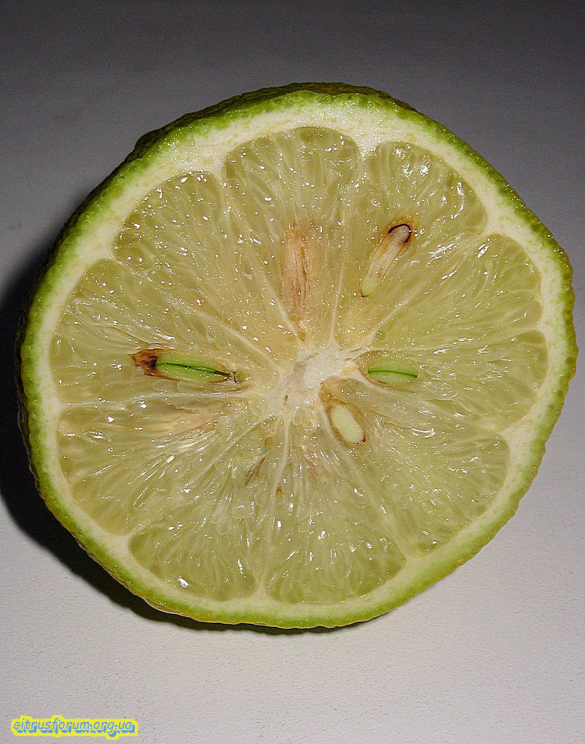 И так, на 319-й день после цветения плод отвалился сам, так и не вызрев до конца. Естественно и не набрал, как в цветовой гамме, так и по вкусовым ноткам. В итоге обычный лимон, не лучше и не хуже магазинных. Сочность соответственно не та, как и повышенная кислотность. Удивила так же толщина кожуры, скорее всего сыграла сухость в моих условиях. Семян полно, не считал...