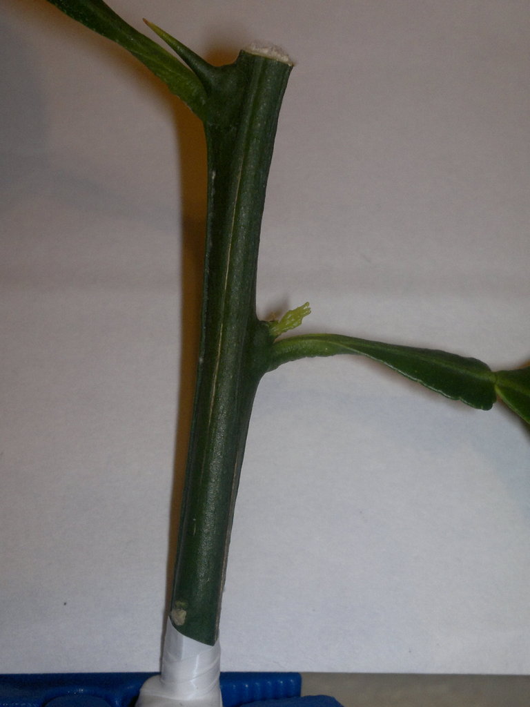 Прикупил и я себе черенок Shiranui (Декопона) у Александра (Bersagliero). Ну и собственно сделал парочку прививок. Сегодня им ровно 4 недели. За это время не отпал ни один листочек, с утра немного досвечивал настольной лампой. Подвой на показанной прививке пробовал прорастать, но я соскабливал все проклевывающиеся почки. Ну и сегодня проклюнулась почка на привое Shiranui. Сфокусировать снимок на маленькой почке было сложно, но ждать с хвастом самой давней хотелки не было больше сил :hi_hi_hi: Через программку попробовал увеличь почку лупой.