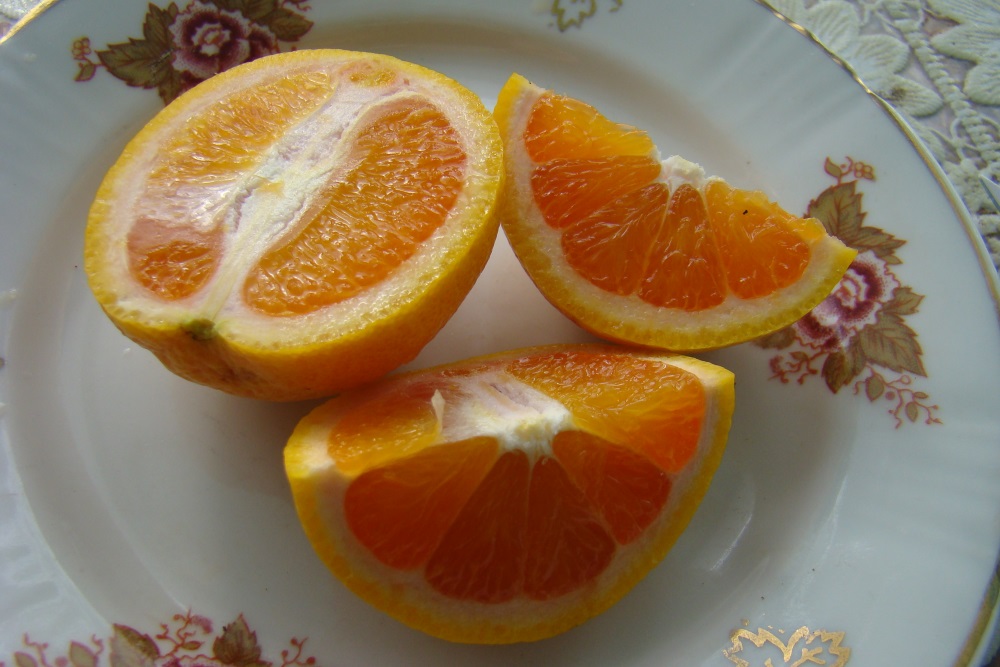 Размер плодов небольшой 90-130гр. Кожура оранжевая, средней толщины. Мякоть янтарно-розовая, очень сочная, присутствует несколько косточек. Вкус удивляет - кислоты нет вообще и на апельсин совсем не похоже. Чувствуется слабый ванильно-сладкий фруктовый сок и необычный арбузно-тыквенный привкус в мякоти.