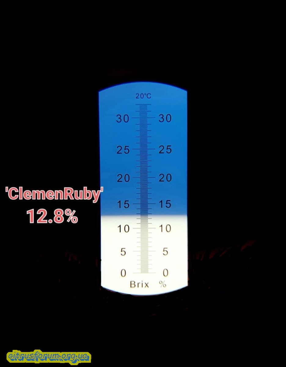 'Clemenruby'. Солодкі і без кислинки, з легким присмаком апельсинки, сегментні мембрани (перегородки) не відчуваються. Чиститься досить легко. 2шт насіння/6плодів, цукристість 12.8%