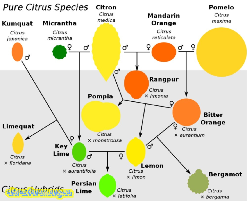 Приклади гібридних цитрусових , що показують їхнє походження від чистого виду засновника