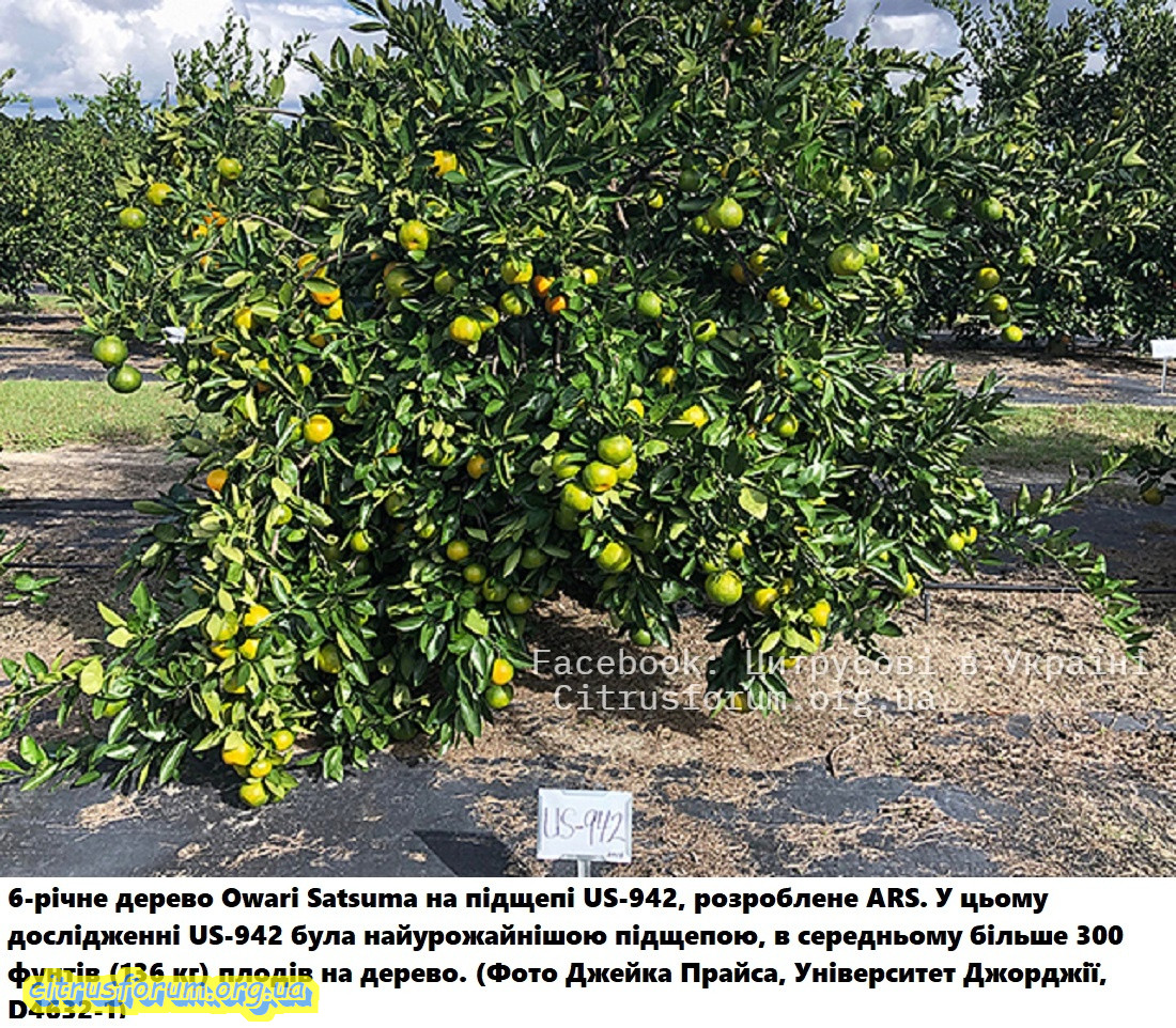 Продуктивність була видатною під час випробувань як на добре дренованих глибоких ґрунтах, так і на важких ґрунтах із високим рівнем грунтових вод. Зовсім недавно US-942 був найкращим у польових випробуваннях, уражених хворобою зеленіння цитрусових Huanglongbing, а характер його толерантності до Huanglongbing був предметом детальних тепличних досліджень. Основні несправності поки що не виявлені. Хоча відносно невідомий в інших областях виробництва цитрусових, US-942, ймовірно, буде найбільш використовуваною підщепою для нових розмножень у Флориді протягом 2018-19 років, випереджаючи раніше найбільш використовувані підщепи Kuharske, Swingle, sour orange і X639. Характеристики та польові характеристики US-942 були описані в додаткових публікаціях (Albrecht and Bowman, 2019; Bowman and Albrecht, 2017; Bowman et al., 2003; Castle et al., 2004, 2011; McCollum and Bowman, 2017; Wutscher і Боумен, 1999).