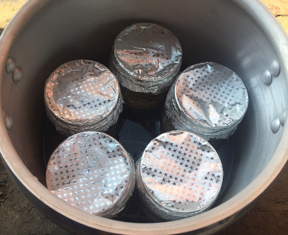 Через кілька хвилин, розсипаємо зерно в банки, а зверху накриваємо фольгою складеною у двоє.
