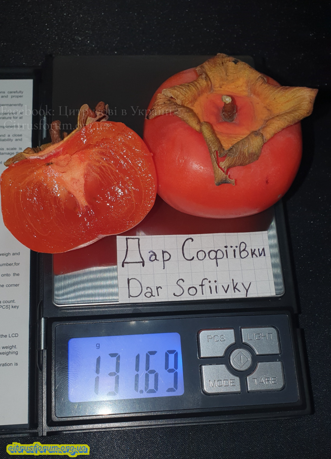 Дар Софіївки (Dar Sofiivky). Смачна! шкірка має легкий горіховий смак. Поступається Нікітській Бордовій тим, що менш соковита та набрала меншу кількість цукру (19%). Вага 80-120г. Мені така хурма подобається.