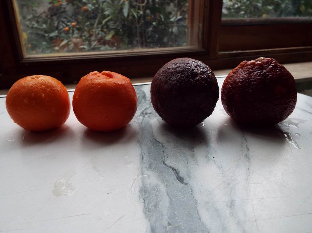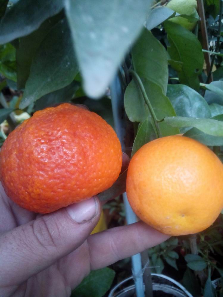 Тангор Амоа8 vs клементин Рубино. Было подозрение что это один сорт под разными названиями. Поэтому в крону дерева-сада были привиты оба сорта для получения плодов в одинаковых условиях. Кожура Амоа8 неровная, плотная, с красными вкраплениями на темно-оранжевом фоне, возможно может стать еще краснее. Активное покраснение произошло после похолодания в начале декабря, когда получился значительный суточный перепад температуры от +5 до +25. Кожура Рубино гладкая, тонкая, ярко оранжевая с красноватым оттенком. На окраску плодов Рубино значительно влияет подвой! На лимонном подвое цвет Рубино скорее желтый, чем оранжевый. Плодов Амоа8 на другом подвое нет, поэтому о влиянии подвоя на цвет его кожуры нет данных. Есть предположение, что итальянский Амоа8 на макрофилле и чешский Трабут на цитрумелло это один сорт, который растет в разных условиях. Для определения этого Трабут был привит в крону Амоа8 - результаты ожидаются на следующий год.