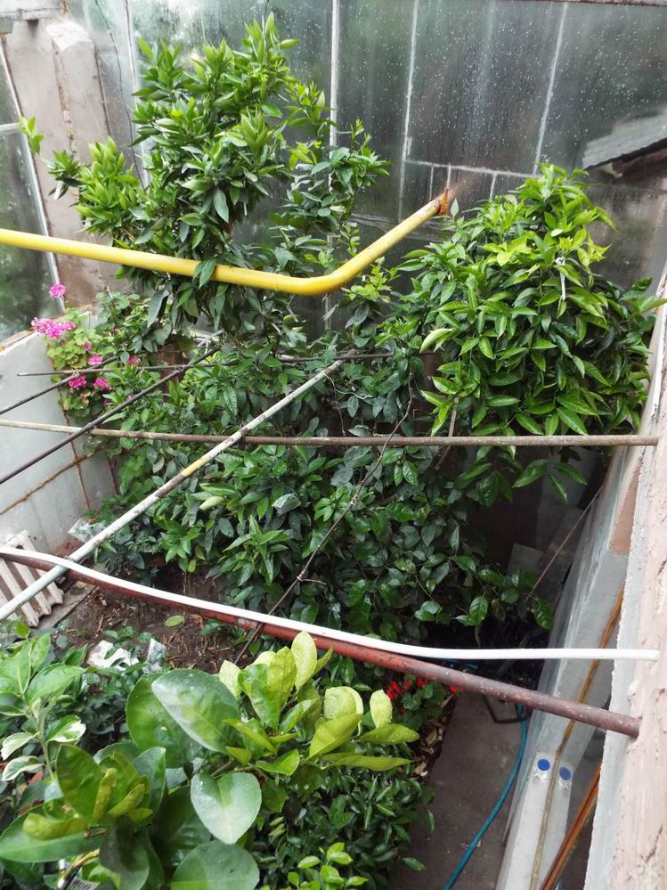 Апельсин Валенсия, растет компактным кустиком, правда не в горшке, а в верхней части кроны дерева-сада Тарокко. Красной стрелкой показано место Валенсии в общей массе привитых сортов