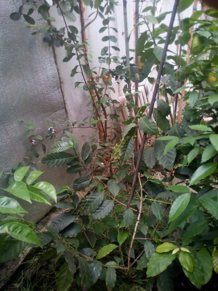 Кофе отходит после зимовки, на заднем плане отцветает фейхоа