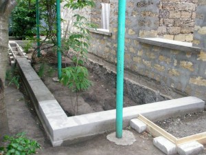 Сегодня сделал опалубку на последний пролёт. А дальше на стену решил ракушняк использовать. Нашёл свои старые записи по смете: заливка траншеи бетоном 3 куба - 2200 грн. Перед этим выкопка траншеи - 300 грн. Потихоньку сам выбираю землю внутри теплицы, а цоколь обошёлся - заливка 500 грн. Вот уже в 3 штуки влез.