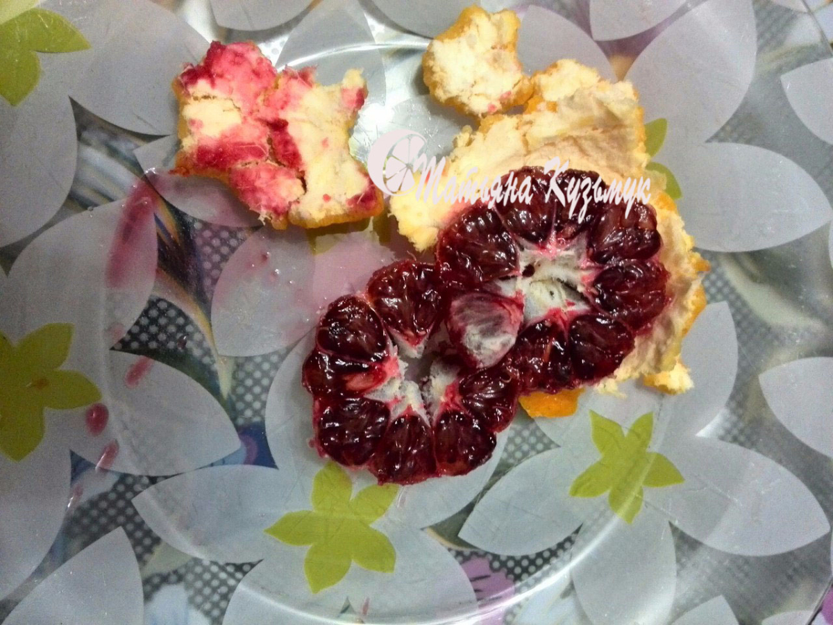 с лева, разрезанный мандарин Уншиу, для сравнения окраса.
