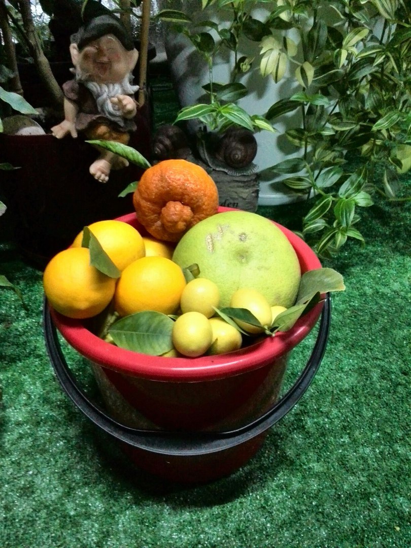 Сняты последние плоды лимона Мейер, немного плодов сразу ушло на угощение, в ведерко поместился плод Свитти, плоды лаймквата, и плод Рубино Россо он же Амоа 8.))
