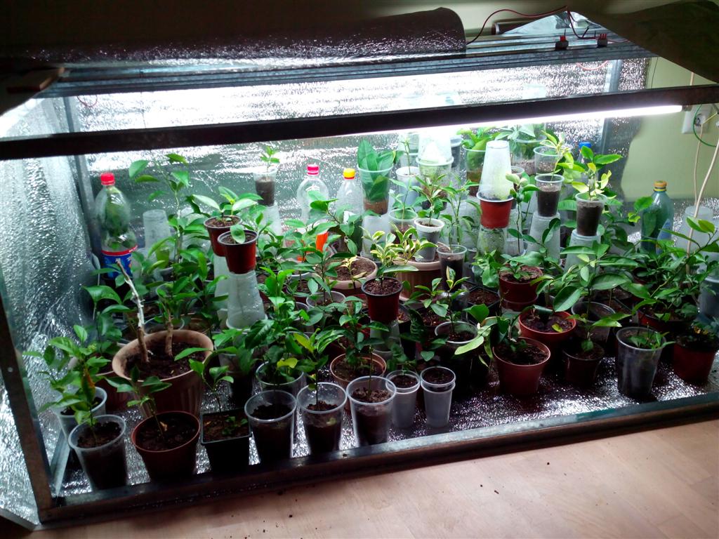 А для маленьких укореняшек и прививок я пошёл другим путём - почти всю мелочь я поселил в построенное для этих целей подобие фитотрона - я зову его "аквариум" (фото ниже)