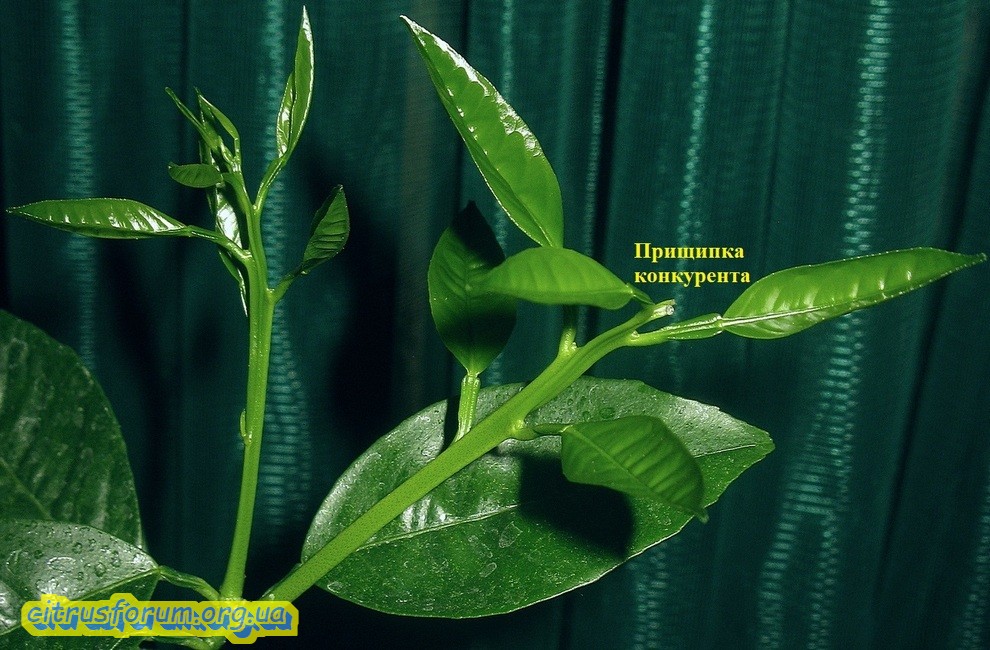 Цитрусовые конечно для меня пока тёмный лес,но всё же не совсем понятно,почему на втором фото не удалить более слабый побег. А после того как более сильный побег достигнет задоной высоты,его можно будет прищепнуть.