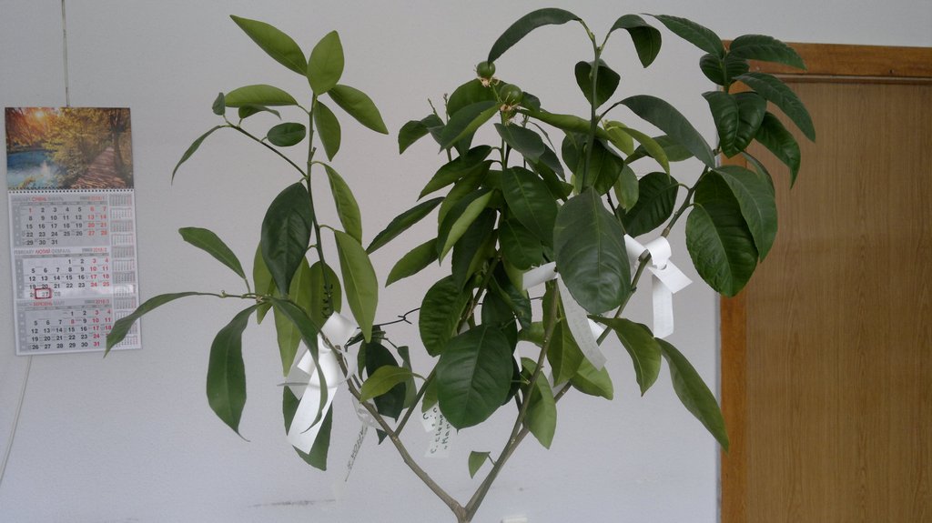 В первом сообщении этой темы http://citrusforum.org.ua/viewtopic.php?p=36182#p36182 описывал и показывал дерево-сад, которое живет на работе. Спустя год можно подвести промежуточные результаты. Каждая из прививок выдавала приросты, многие сорта цвели (некоторые цвели и завязывали плоды, в отличии от растений с которых были срезаны и живут дома на лоджии). Сейчас есть завязи размером с небольшую вишню на ветке клементина Marisol. Перед этим Новым годом удачно привил MANDARED и Amoa 8. Теперь у него в кроне 8 сортов.