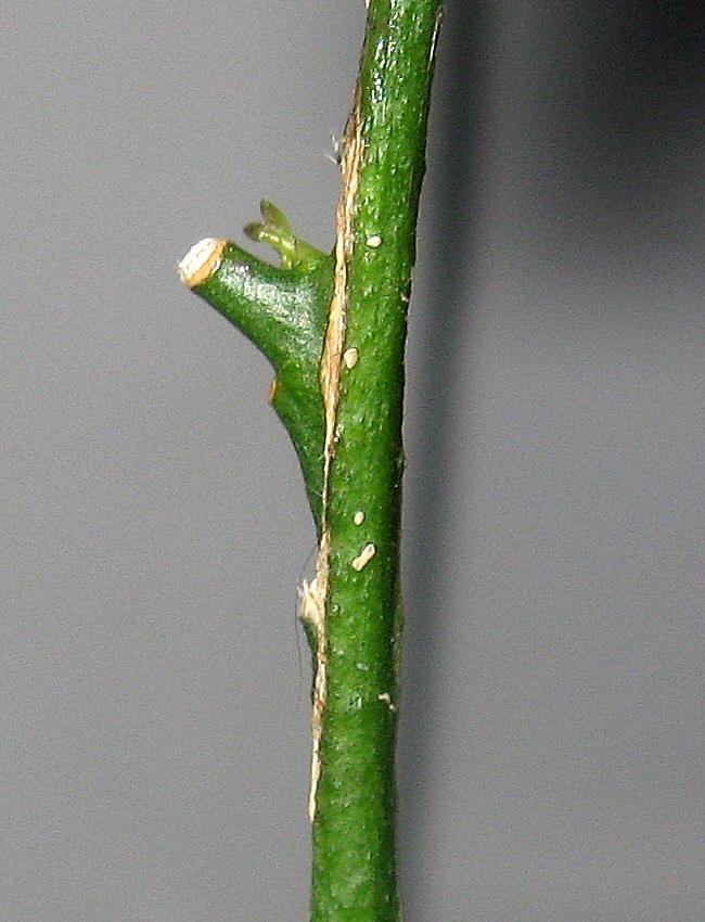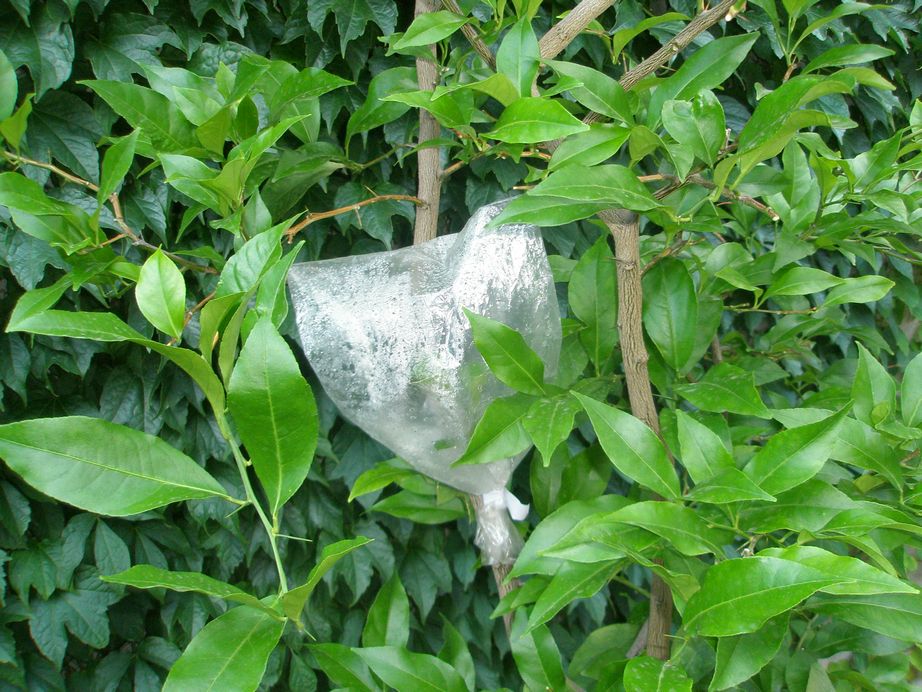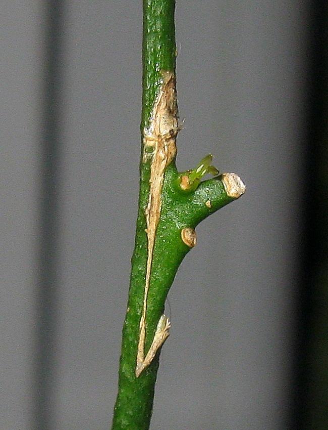 Прививка на 12-летний сеянец лимона в середину кроны в приклад на центральный ствол итальянским лимоном сиракузано. Все три почки оказались генеративными. Перепрививка на черенок итальянского лимона в расщеп крупноплодного лимона. Листья немного подгорели на солнце, но черенок зелёный. Прошло 18 дней.