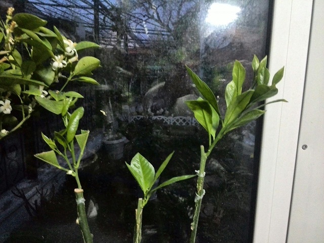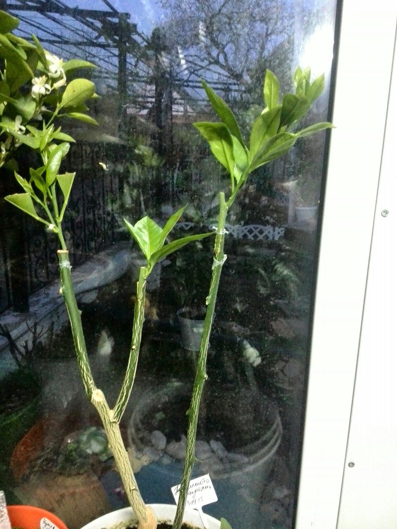 Прививки сделаны поздней осенью, апельсин проснулся раньше, а трифолиата похоже дольше была в дреме, и прививки вот только начали расти.