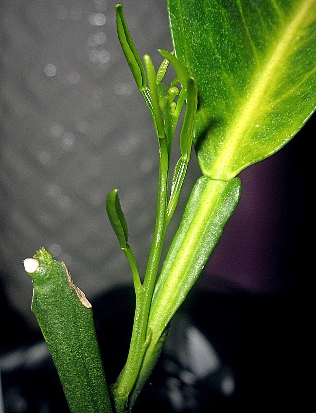 В продолжение прошлого поста... На прошлой странице показывал один из "тугодумных" апельсинов: http://citrusforum.org.ua/viewtopic.php?p=37763#p37763 Сегодня присмотрелся к уже достаточно оформившемуся приросту и заметил нечто.