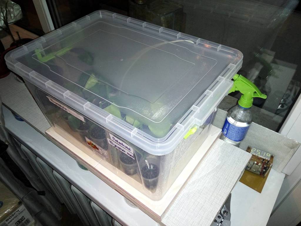 Вот такую теплицу мне муж соорудил .Деревянный короб , внутри на стенах пенопласт ,по верху пенопласта изолонг,подогрев внизу сделал типа теплого пола(нихромовую проволку заливал).Пока проводили испытания ставили в теплицу что не жалко(поставила на укоренение верхушки сеянцев лимона ,оставшиеся после прививок ).Температуру держит от 23 гр до 26 гр,стоит регулятор температуры (самодельный).Подсветка стоит сверху светодиодная над теплицей ,свет включается одновременно на подоконнике и над теплицей,стоит таймер включения с 5 утра до 7 и с 17 .00 и до 21.00.