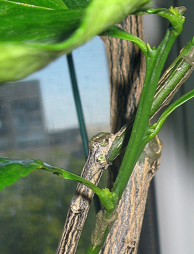 Сегодня заметил прорастание пред последней прижившейся на сегодня прививки на моём дерево-саде.
