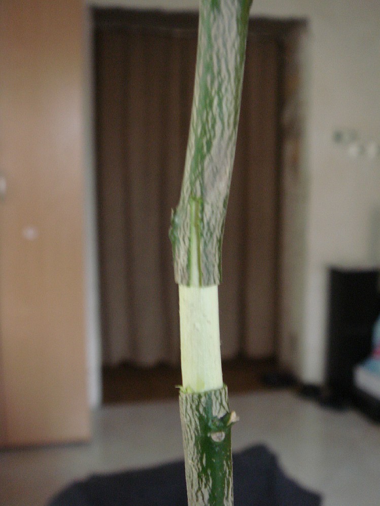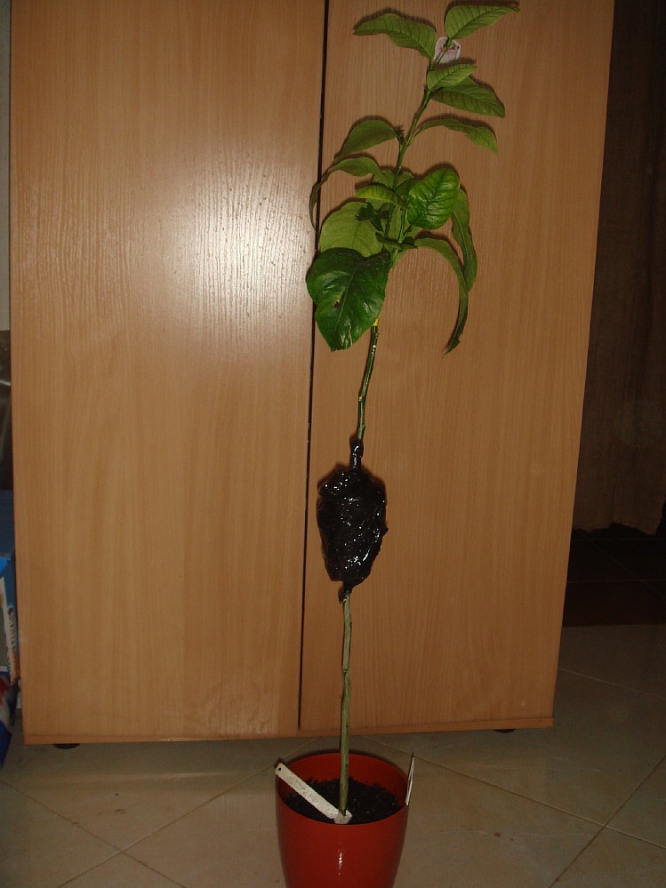Вот и я опробовал метод воздушной отводки на практике. Осенью мне достался почти метровый сеянец цитрумелло, и конечно же я сделал прививку на высоком штамбе. Прививал C. clementina "Fortune". Прививка успешно прижилась и пошла в рост но все же штамб показался мне слишком высоким и я решил сделать воздушную отводку. Купил сфагновый мох, срезал кольцо коры на нужной высоте припудрил корневином и забыл на 3 недели.