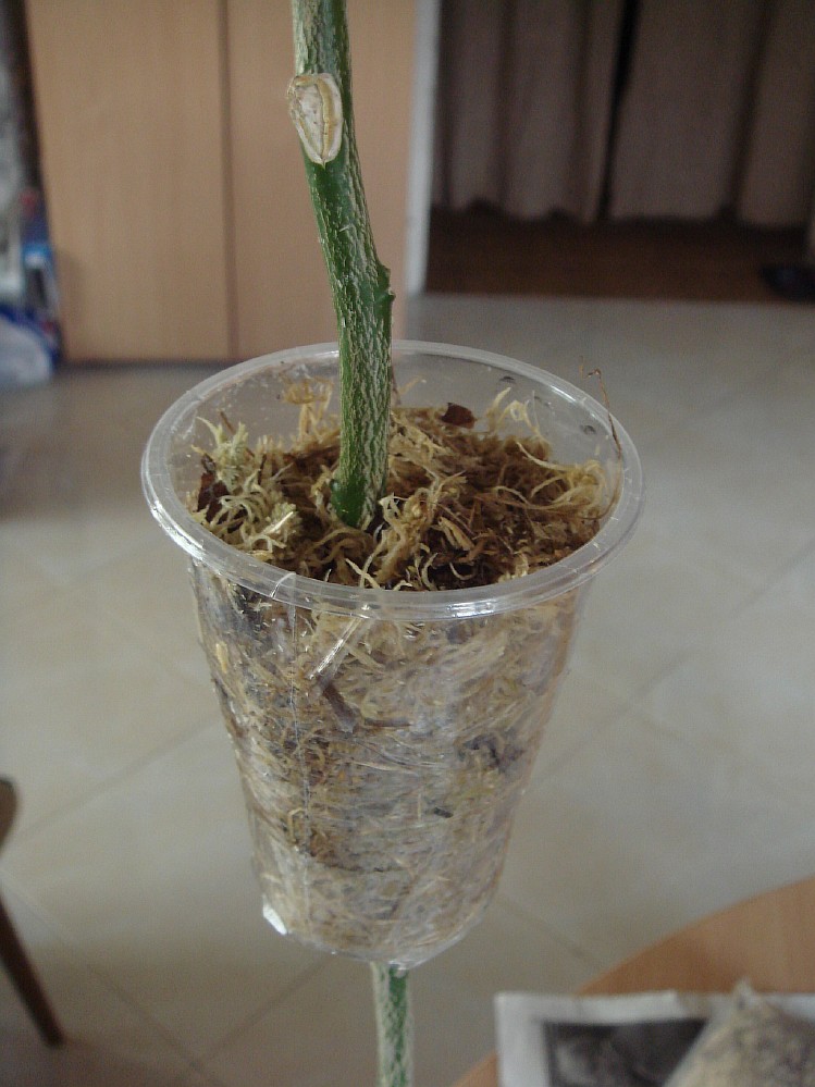 Покажу и я свое рукоблудие. Есть у меня один динозавр (бергамот на цитрумело) общей высотой около метра :sh_ok: Достался мне как компенсация за определенные "бока" одного поставщика. Такая удочка мне не нравится и вот решил укоротить. :hi_hi_hi: Идея с пластиковым стаканчиком мне очень понравилась так что решил позаимствовать. Очень удобно и даже, так сказать, эстетично :-ok-: Внутри сфагнум, смоченный раствором корневина. Кроме среза кольца добавил еще три вертикальных среза, надеюсь на увеличения корневой "массы". :ti_pa: Сам стаканчик обмотал черной стреч пленкой. Будем наблюдать и отчитываться.