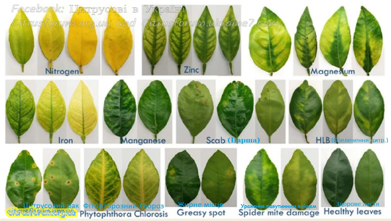 Признаки нехватки элементов питания / Оприділення хвороб та мікро-макро елементів по листях