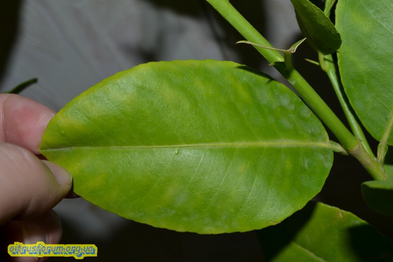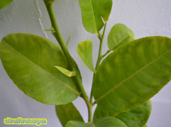 Я его только купил! У человека он стоял в теплице где светло. Кормит он их говорит, конским навозом перебродившим то есть нехватку азота можно исключить, а вот нехватка железа это как вариант. Материнское дерево у него нормального зеленого цвета, не салатового.