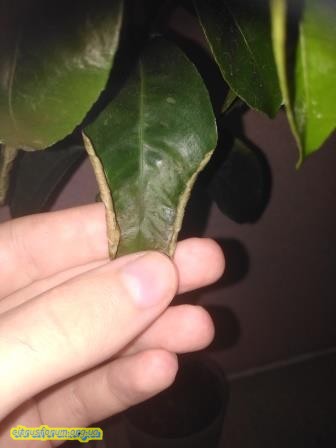 Итак, не сумев побороть краевой ожог, прочитав, что листья засыхать могут и от перелива, сквозняков (на кухне приходится окно открывать), от сухости воздуха. Переставил в октябре его на шкаф далеко от окна. Хоть я и поливаю умеренно мандарин, но решил его просушить. 2 недели он так и стоял на шкафу, поливал пару раз немного, практически не опрыскивал. Краевой ожог прошел, но посохли листья, поскручивались и опали. Вернул на окно в комнате, опрыскиваю, поставил рядом банку с водой. Он уже второй месяц не ростет (я так понимаю в зимнюю спячку ушел, прошлой зимой рос). Листья продолжают крутиться, предварительно на них по краям появляются темные (не как раньше светлые желтые, а потом сухие светлые) пятна.