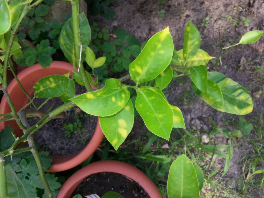 У Вас желтизна преимущественно по жилкам, что характерно для грининга. Грининг имеет три разновидности- схожие между собой азиатскую и американскую. которые переносятся цикадкой (листоблошкой) Diaphorina citri и африканскую передающуюся цикадкой Trioza erytreae. Другие насекомые эти бактерии не переносят, но болезнь также передается при прививке зараженным материалом.