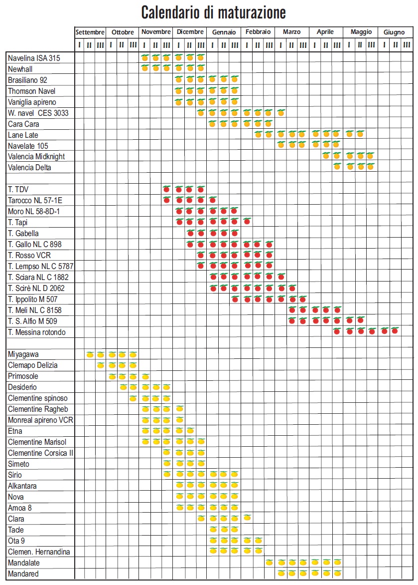 Еще одна сравнительная табличка сроков созревания разных цитрусовых включая новейшие пигментированные гибриды.