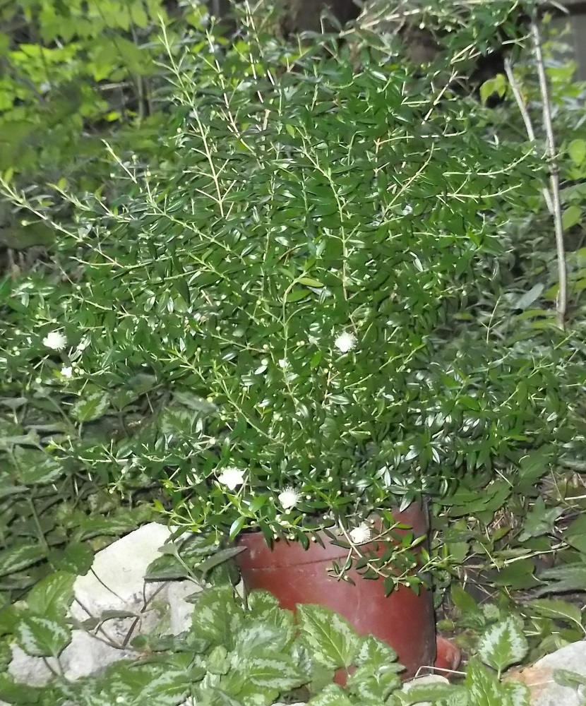 Мой мирт, в первый раз зацвёл. Выставил его на улицу, в тени деревьев, может пчёлки его опылят и ягодки завяжутся, попробую на вкус