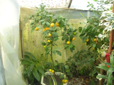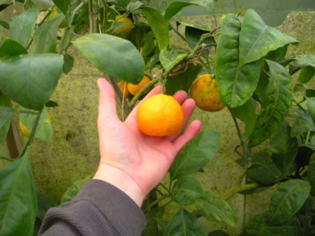 Через некоторое время появился мандарин. Он, больным и чахлым, но довольно крупным, был выменян на ящик других растений. Предыдущая хохяйка сказала, что муж привёз его из командировки с Кавказа. Думаю, что это обычный Уншиу широколистный. Может ошибаюсь? Вылечился и подрос, стал радовать плодами. В 2013 их было штук 30.