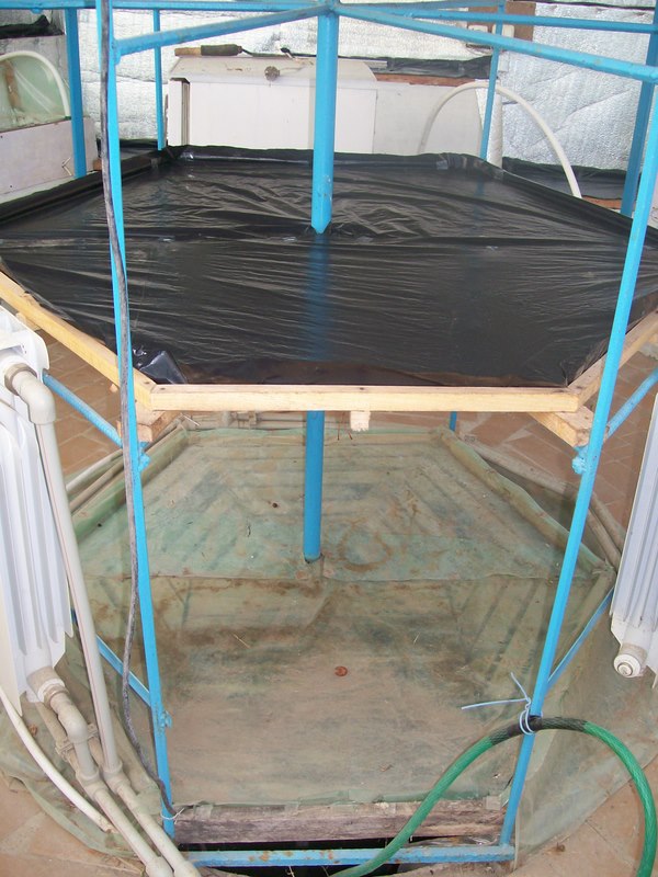 А сам шестигранник поддерживает купол ( там, далеко вверху, он преобразуется в пятигранник). А купол поддерживать надо для того, чтобы мне не было страшно лазить по верху в моменты смены пленки.