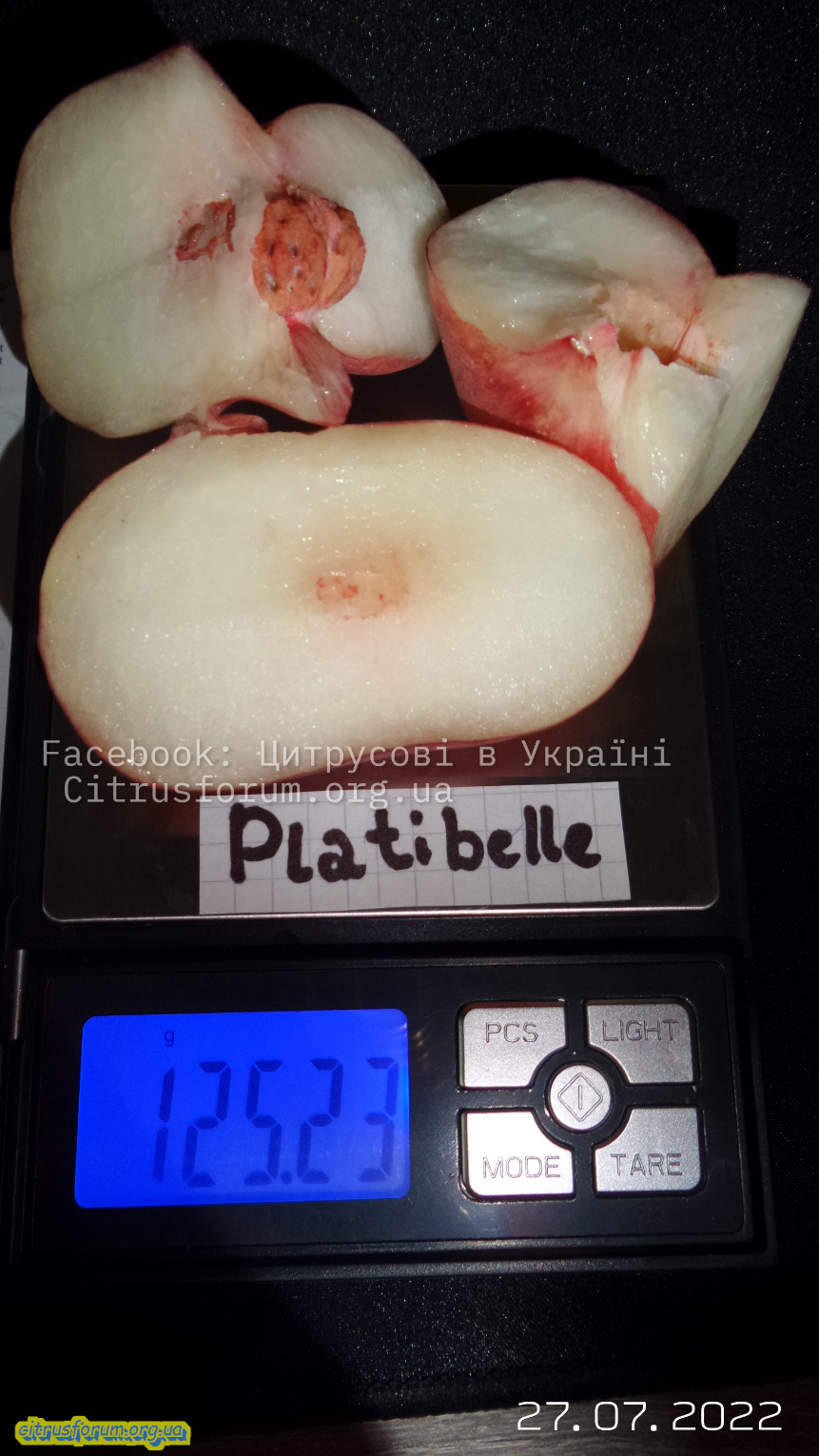 Інжирний персик 'Platibelle', солодкий, без кислинки. Мякоть не сильно хрустка, середньо-соковита.