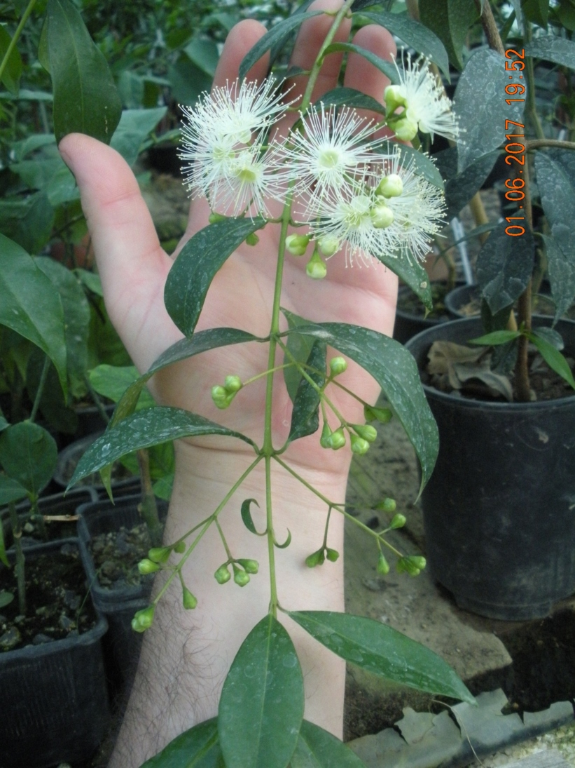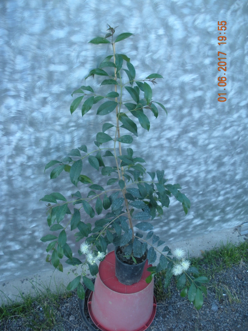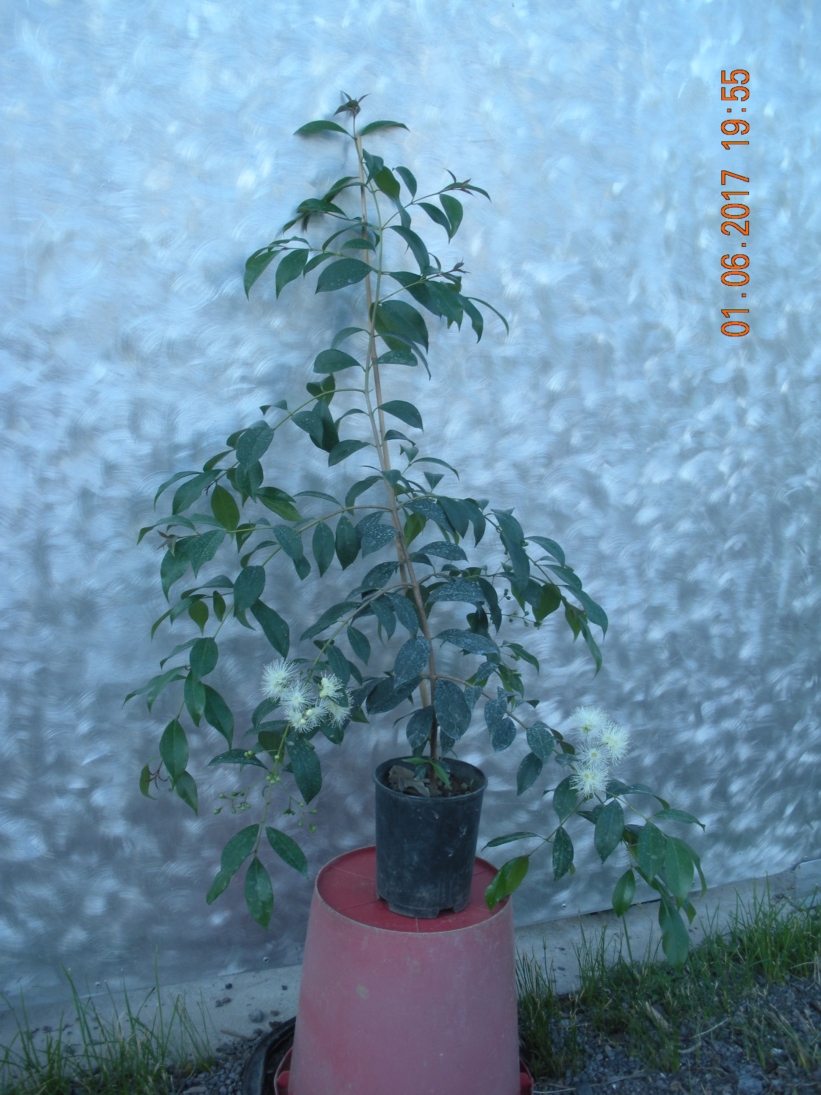 Но кто меня удивил ещё больше, чем маракуйя, так это сизигиум масляный (Syzygium oleosum), или Blue Lilly Pilly. Получил в прошлом году от друга небольшим черенком, а он неплохо вымахал и зацвёл. Очень надеюсь попробовать плоды. Я думал, надо будет ждать несколько лет.