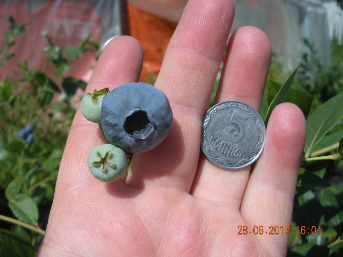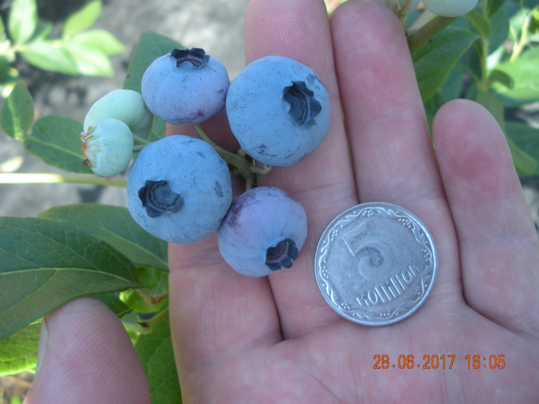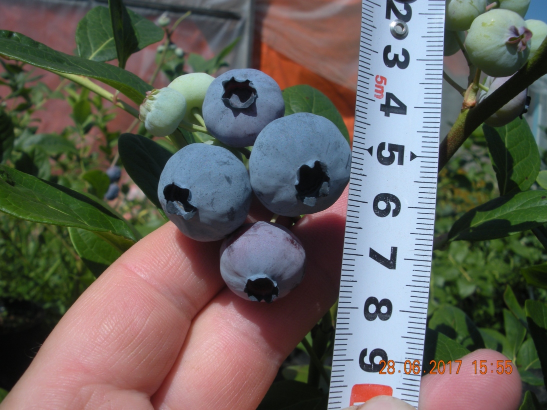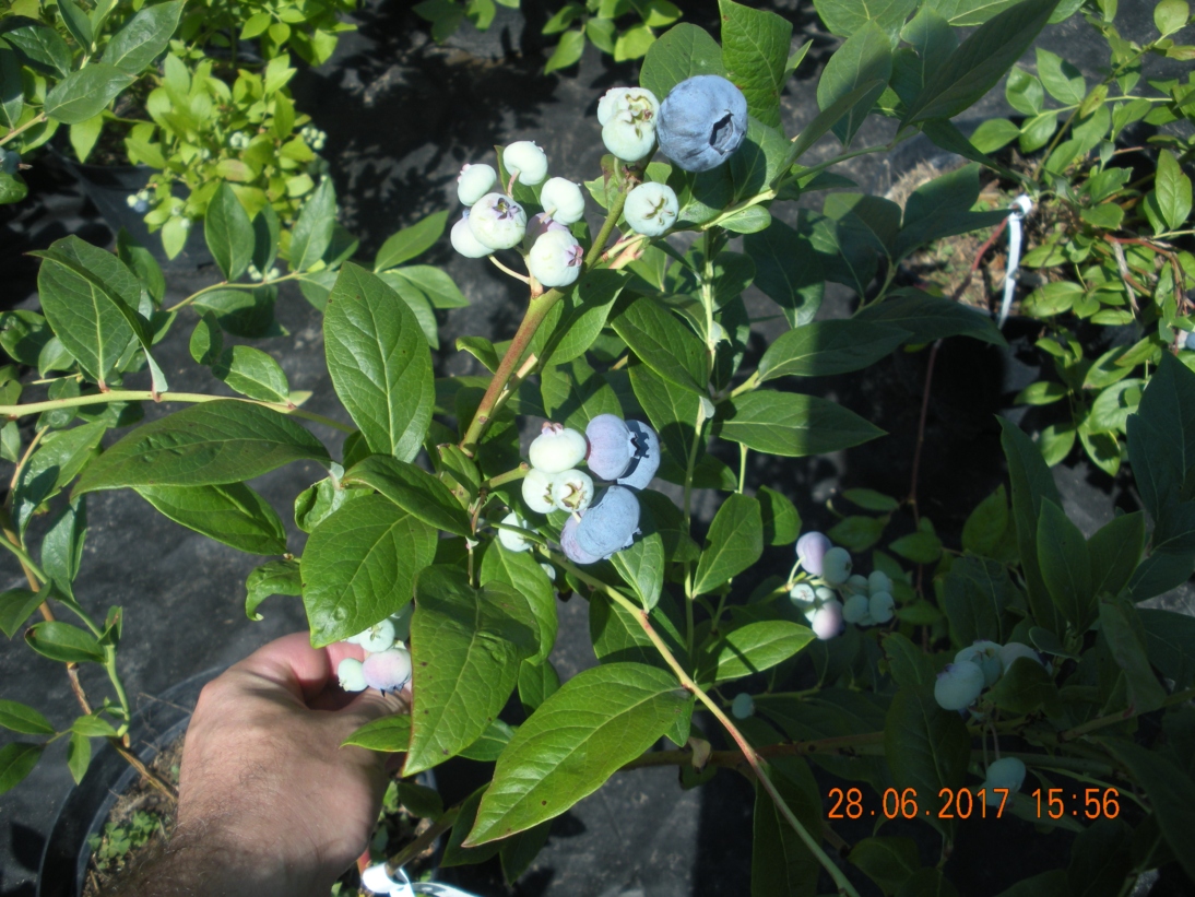 На днях фотографировал голубику, растущую у меня в контейнерах. Это сорт Sierra. Первый урожай, да ещё в горшке, ягод в кистях пока не очень много, размер разный. Но всё же...