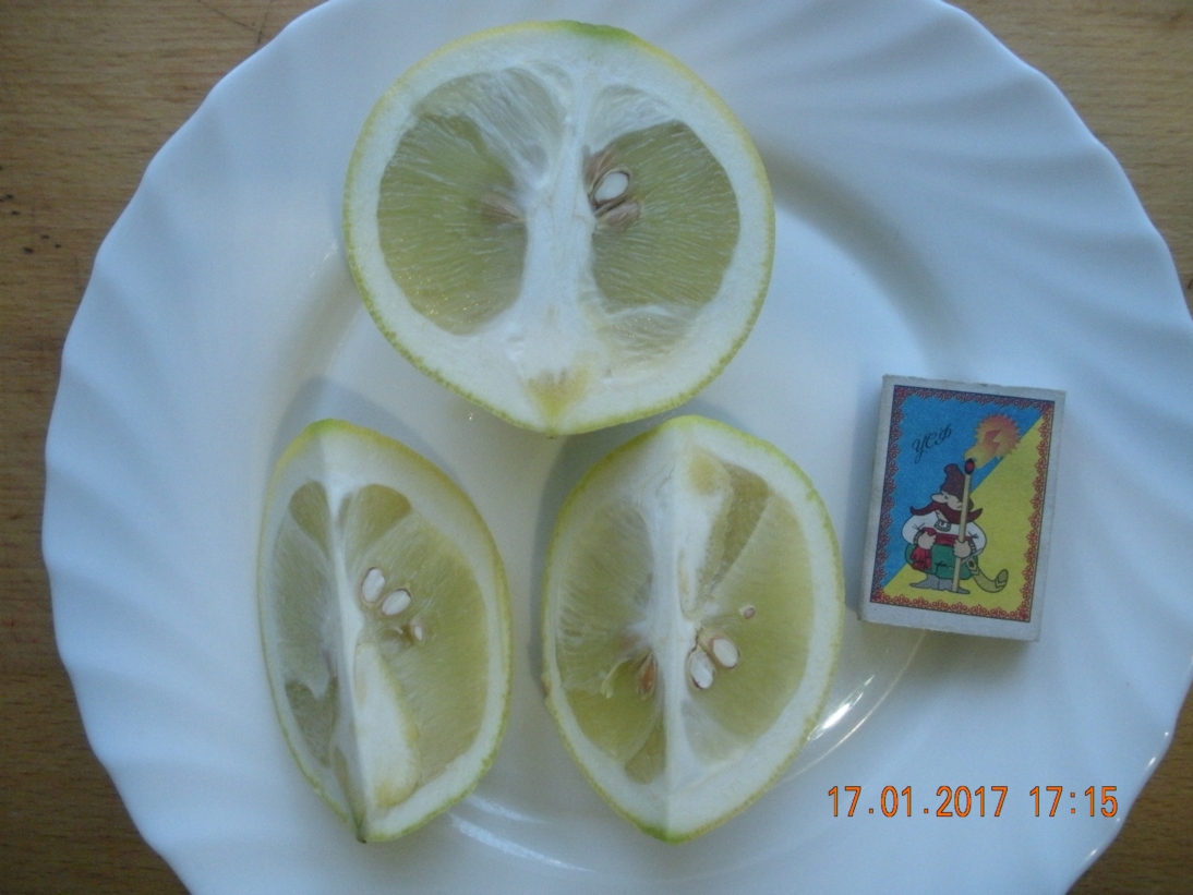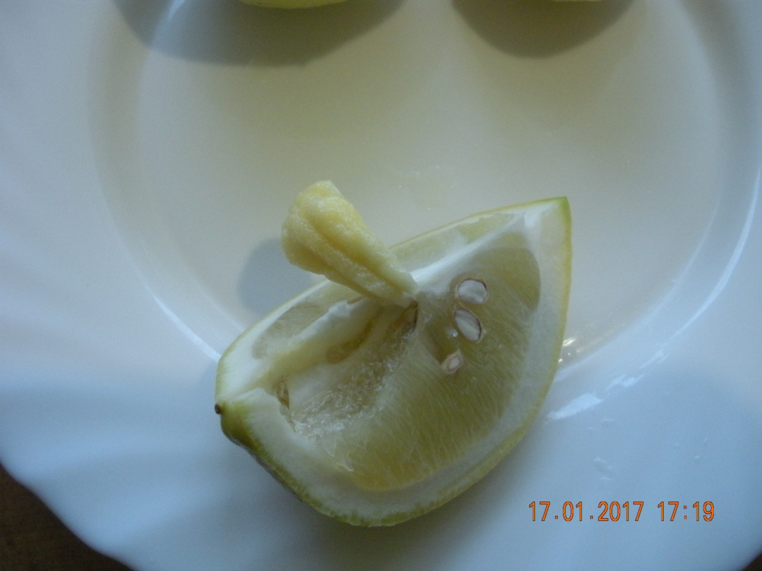 Явно не бессемянный, да ещё и чуть ли не пупочный получился. На вкус оказался кислее лимона. Я решил снять все остальные плоды, кроме одного, который оставил на полное дозревание.