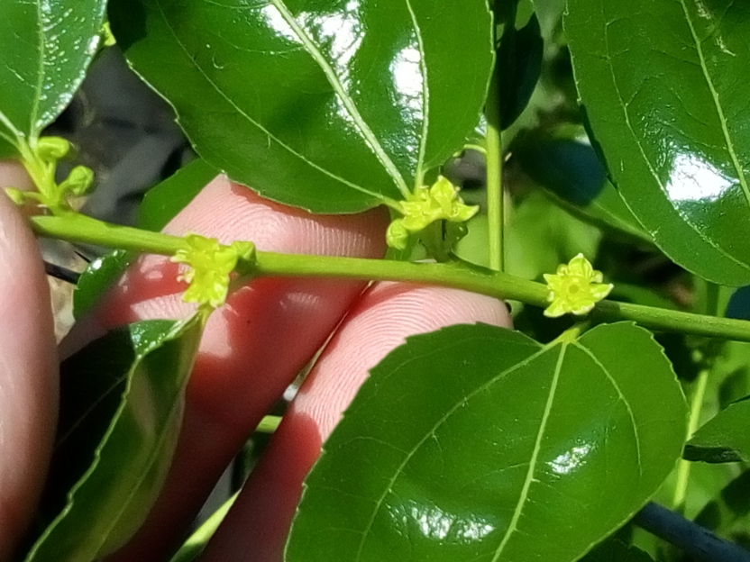 Ежевика Loch Tay начала окрашиваться, хотя размер ягод ещё маленький. Это её первое плодоношение в контейнере на небольшом прошлогоднем побеге.