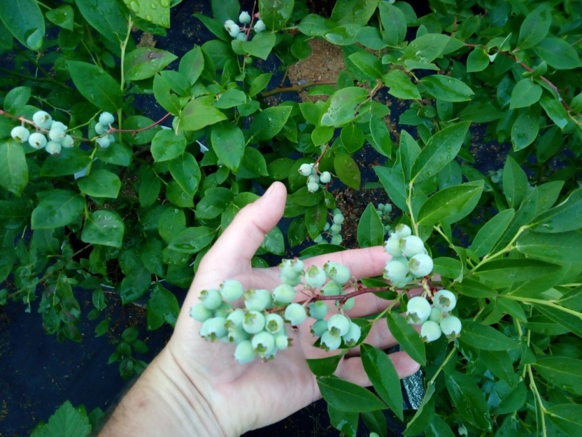 Розовоплодная голубика Pink Lemonade пока что слабовато завязала, да и ягода у неё некрупная. Возможно, в следующем году урожайность повысится.