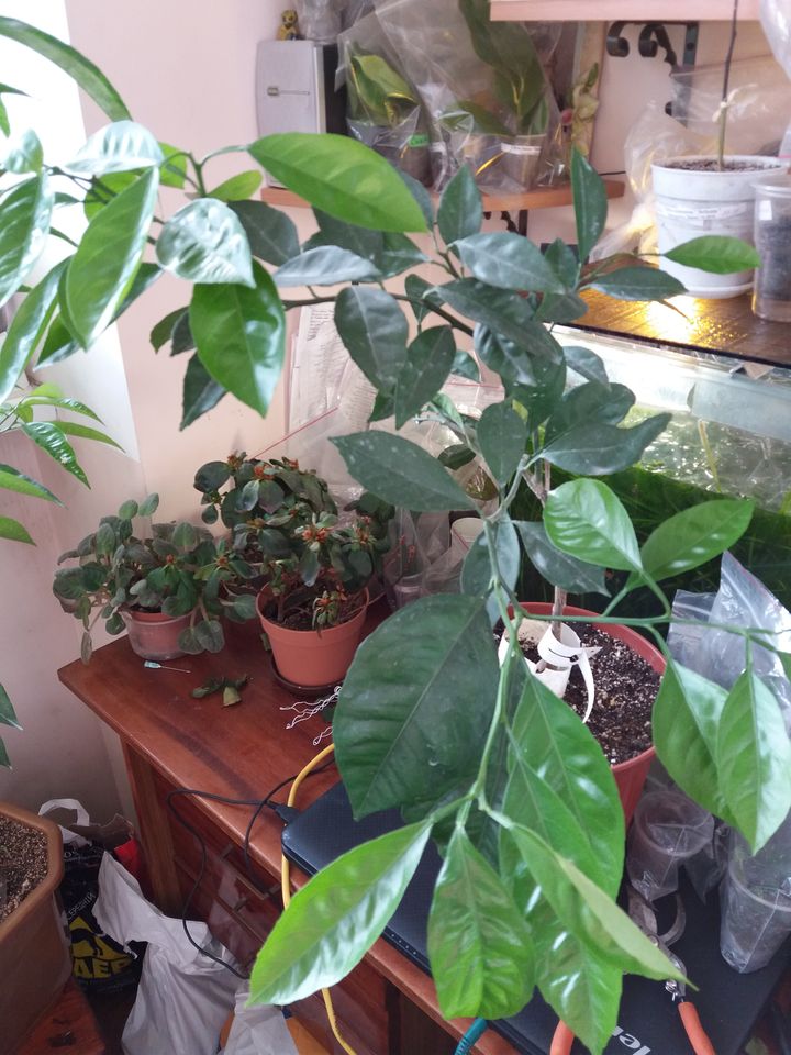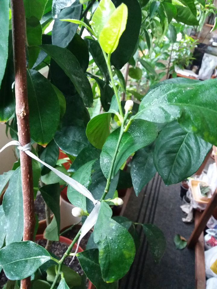Мандарин unshiu “Kawano wase”. Проглядела я зимой проклюнувшийся росток на подвое, в итоге решила оставить, вырос, срезала верхушку, привила веточкой того же мандарина, так сказать для увеличения продуктивности растения, сомневалась, приживется ли, успела ли вызреть ветка дичка, культурное растение в это время спало. Но все хорошо, срослось, почки на прививке набухли, мандарин пустился в рост и выпустил несколько бутонов.