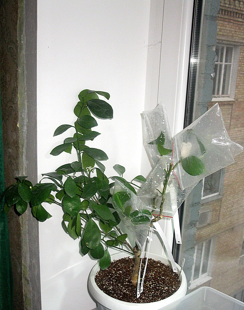 Что то долго я сюда не забегал, постараюсь исправиться и поделиться новостями. Собственно она одна, но довольно ёмкая. :-) Начну с того, что недавно были приобретены несколько черенков от наших форумчан, за что им огромное спасибо! Естественно это богатство надо было куда-нибудь пристроить. Поскольку готовых подвоев не оказалось было принято решение прицепить это всё на свой каламондин. Всего было сделано десять прививок, прижилась половина. На остальной половине черенки сбросили листву и начали чернеть в течении первых пяти дней после прививки. Причина проста, у черенков оказался подморожен камбий, хотя я думал что только листья пострадали.