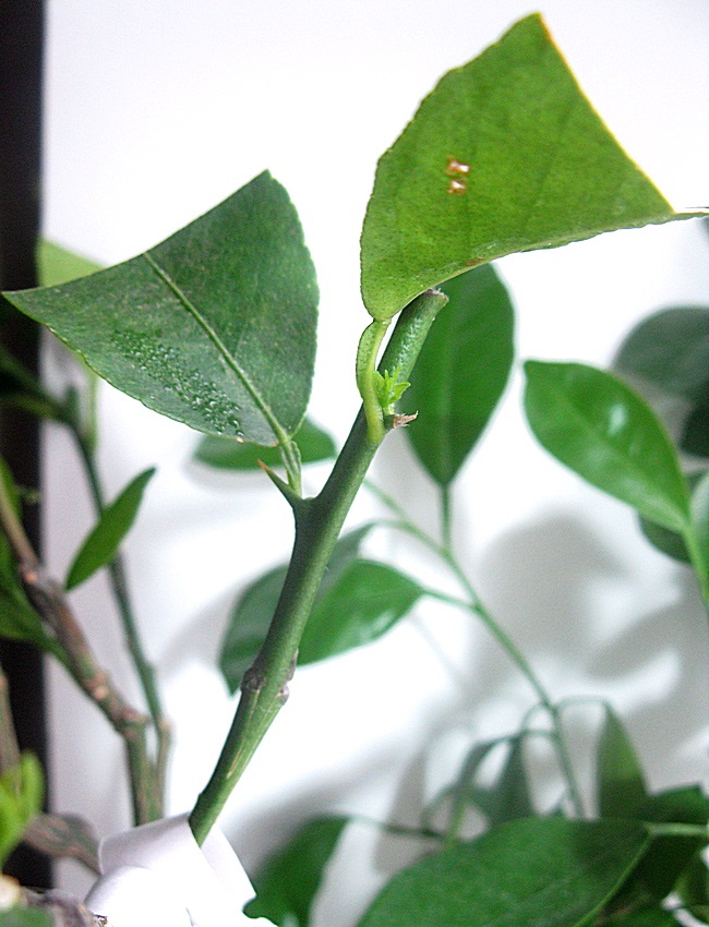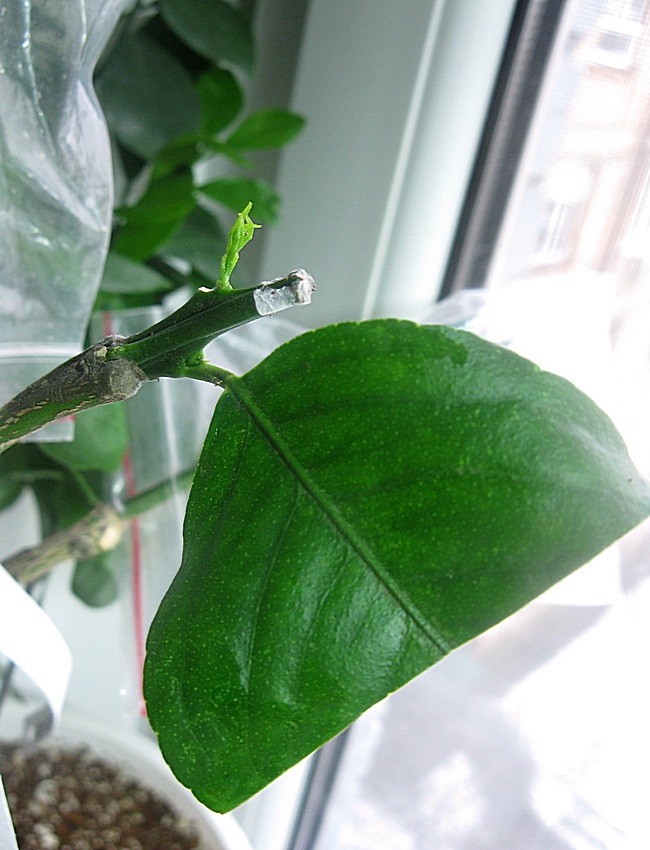 Приветствую всех снова. Здесь http://citrusforum.org.ua/viewtopic.php?p=46823#p46823 спрашивал совета по спасению мандарина сорта C. deliciosa Cami. Было несколько дельных советов от форумчан, за что им огромное спасибо. Основными были советы по реанимации и по пере прививке. Не знаю, как на счёт материнского саженца, думаю шансов мало. А вот прививка похоже удалась. Здесь http://citrusforum.org.ua/viewtopic.php?p=46879#p46879 всё о самой прививке и снятии обвязки. А на сегодня, похоже заметил просыпание почки, в пазухе единственного оставшегося листа на привое. :ya_hoo_oo: