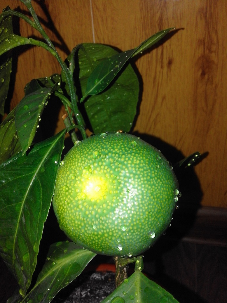 Есть у меня одна мандаринка которой по всем правилам еще очень рано плодоносить. Но так получилось, что вначале не заметил на ней цветения, потом почти два месяца был в командировке, а когда уже увидел плод он был уже хорошего размера и решил его все таки оставить ради эксперимента. Конечно я думал, что этот малыш сам его со временем сбросит, а мандаринка все продолжала наливаться при этом еще и выдала один не большой прирост.