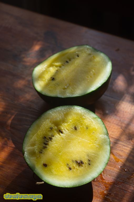 Арбуз желтомякотный, сорт Янусик - ягоды около 2-3 кило, получились слабосладкие, были огрехи в агротехнике. Но некий привкус, отличный от красномякотных сортов, присутствовал.