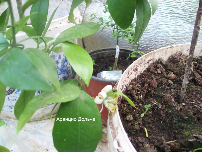 Аранцио Дольче выдал весной один плод на поникшей ветке и теперь на ней же опять цветет.Центральный стволик гонит только ботву