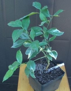 Пестролистный Тарокко. Имеет тенденцию отращивать время от времени полностью бесхлорофильные побеги с такими же листьями. Тоже ещё не цвёл у меня. Но, несмотря на всё это - красавчик)).