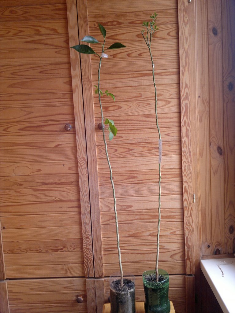 мой (dandr)арий полнился редкими новичками: Танжело Melinghina и гибрид MANDARED. А также воспилнилось два сорта, которые раньше у меня пропали: апельсин Фрагола и кумкват Мейва. Так вот Мейва и Мандаред привиты на цитрумелло на высоте 86 см. Хотел высокий штамб для горшка, что стоит на полу, а крона над подоконником балкона. Черенок Мейвы был с кучей листвы и всю ее скинул, но уже есть молодой прирост. Мандаред был с 4 листиками и довольно быстро выпустил новый прирост, но сбросил его в тепличке (в этом не очень урочном прививочном сезоне такое случалось на разных прививках. Связываю с тем, что прививки стоят на окне и возможно перегреваются во время кратковременного появления "зимнего" солнца. Обычно прямого солнца избегаю.). А вот Фрагола и Меленхина привиты в крону одного из зацвевших в прошлом году сеянцев, о котором писал здесь: http://citrusforum.org.ua/viewtopic.php?p=21383#p21383. Вот теперь думаю, как поступить с третьей "дикой" веткой? Отрезать или что-то на нее привить?