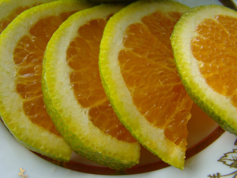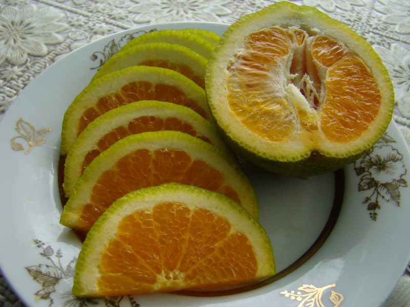 Решил я сегодня попробовать плод ОТА38. Окончательно он так и не окрасился, скорее наоборот - позеленел и почти вдвое увеличился. Чтобы не мешать расти меньшим плодикам и боясь, что мякоть станет рыхлой и не сочной я его срезал. Конечно внутри плод рыхловат, но сока достаточно. Вкус очень понравился - насыщенный, кисло-сладкий, вполне сравнимый с покупными апельсинами, но более яркий и со своим не апельсиновым ароматом. А еще понравился яркооранжевый цвет мякоти. Семян небыло.