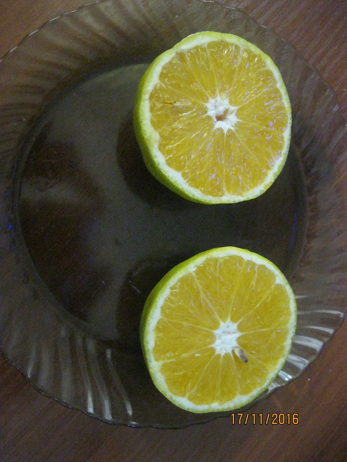 Ну вот и сорвал я свой первый апельсин! Правда сорт не знаю! Может Вы подскажите!?При разрезе пошёл очень сильный запах на мой взгляд как у обычного покупного апельсина! Семян было 3 штуки и то не доразвитые,кожура тонкая легко отделяется,а на цвет кажется что это какой то из пигментированных сортов!На вкус сладкий с лёгкой кислинкой и очень нежный не навязчивый как у покупных!После вкусье определяется еле уловимый привкус мускатного ореха!Апельсин очень вкусный!Хочу ещё!!!!