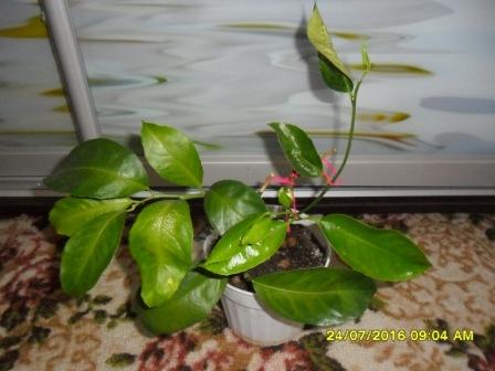 Еще из плодовых есть у меня гранат бейби. В этом месяце выполнилось ему два года, был выращен из семян.Впервые зацвел прошлым летом, но плодов не завязал. В этом году завязал два плодика, недавно еще один заметила маленький, и еще бутончики растит :smu:sche_nie: